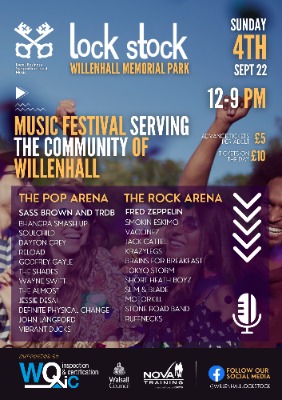 Willenhall Lock Stock is the largest community event in the town and possibly the surrounding area of the Black Country . It is a not for profit music festival that caters for local musical tastes and promotes local bands and solo artists . The festival takes park in Willenhall Memorial Park and caters for between 3000-5000 visitors . There are food and drink concessions but guests are allowed to bring in their own food and drink with in reason for their own consumption . This is the 5th year and the festival is a great day out .